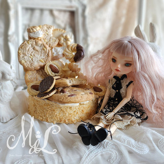 大きいものから小さいものまで焼き菓子を取り揃えたドールチェアです。