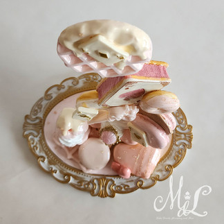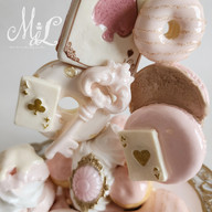 淡いペールピンクをベースにしたワッフル、マカロン、ハートドーナツ、サントノーレ、ドーナツなどなどを積み重ねて、鍵やトランプなどのモチーフをあしらい