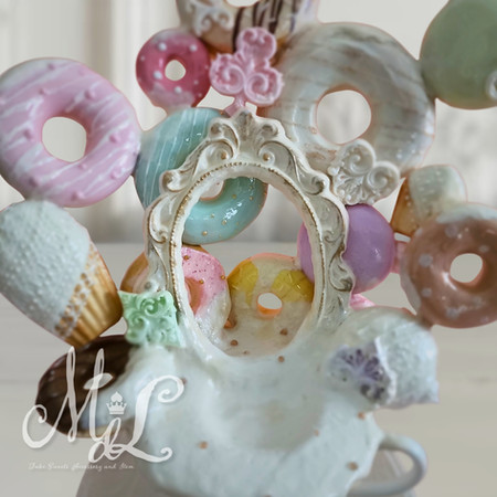 たくさんのカラフルなドーナツやアイシングマドレーヌに囲まれたティーカップには
