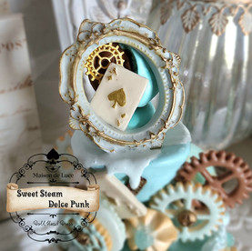 アンティーク調フレームには歯車マカロンやトランプを飾りました。