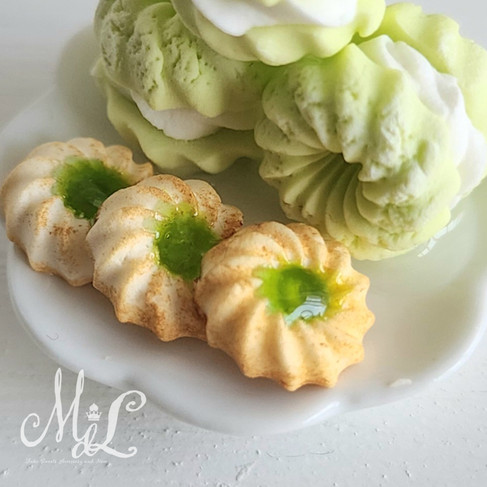 爽やかな色合いのフレンチクルーラー3つと緑の実ジャムのクッキー3つのセットです。