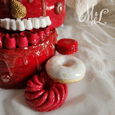 ちょっぴりクリームの塗りが粗い深紅のケーキを赤×白×金の焼き菓子や苺やキャンディで立飾り立てました。