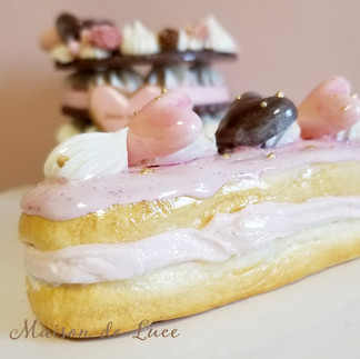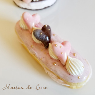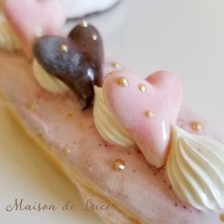 エクレアにもたっぷりの苺クリームをサンドし、ハートチョコを飾りました。