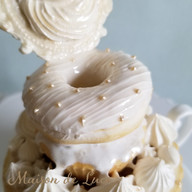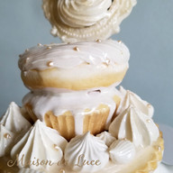 ティーカップの上には大きなバタークッキー・形の違うホイップクリーム・カップケーキ・ドーナツを乗せ